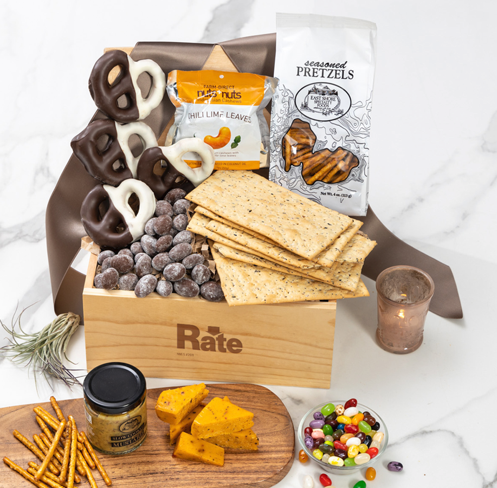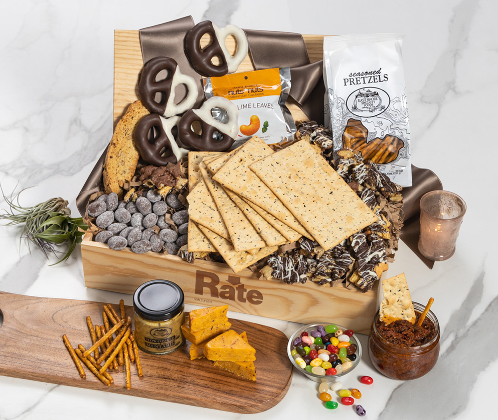 Send warmest wishes with a gathering of delectable favorites. Medium includes tomato basil cheese, two-tone pretzels, everything flatbread crackers, toffee-dusted almonds, spicy mixed nuts, pastel jelly beans, dill mustard, and seasoned pretzels. Large adds almond biscotti, sundried tomato spread, and chocolate crisscross crunch. Extra large adds cocoa almond biscotti, lemon almond biscotti, crème brulée toffee nuts, chocolate dipped macaroons, and cocoa cookies. Each size arrives gift-wrapped in a handcrafted wood crate with ribbon.