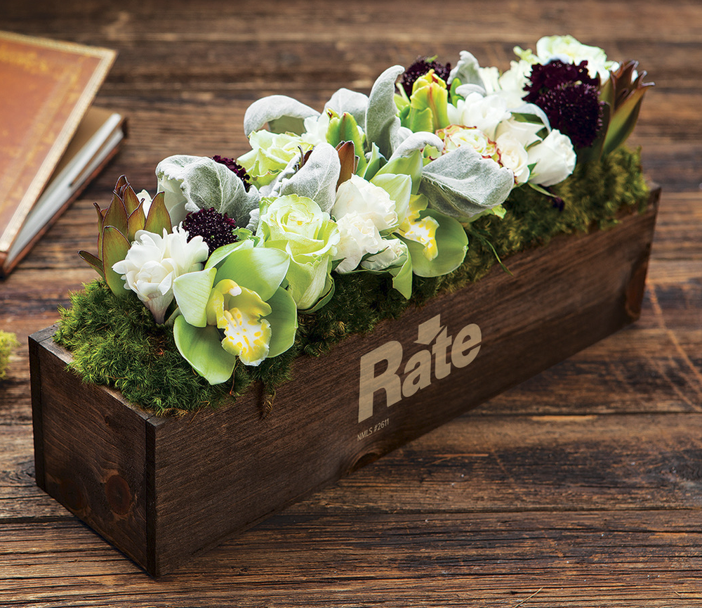 Gracefully evoking a feeling of serenity, a simple gathering of delicate white flowers accented with deep eggplant, vivid chartreuse, and soft silver is displayed in a dark stained hand crafted wood trough. Bianca Grace measures approximately 15" x 4" x 8" to top of arrangement and requires next day shipping.